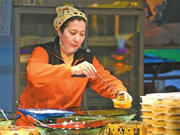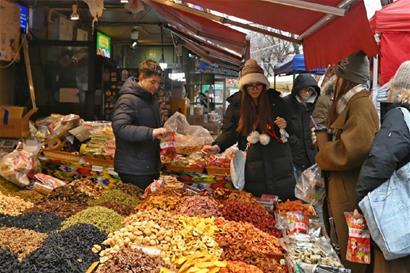 另一边的大巴扎景区里人声熙攘,摊主们热情地招揽着过往行人,摆满摊位的干果构成一幅斑斓画卷,人们一边挑选美食,一边谈笑风生,呵出的白气里都带着葡萄干与馕的甜香。从清晨到日暮,这座城市最质朴的生机,就这样藏在扑鼻的美食与喧闹的烟火之间,鲜活而温暖。